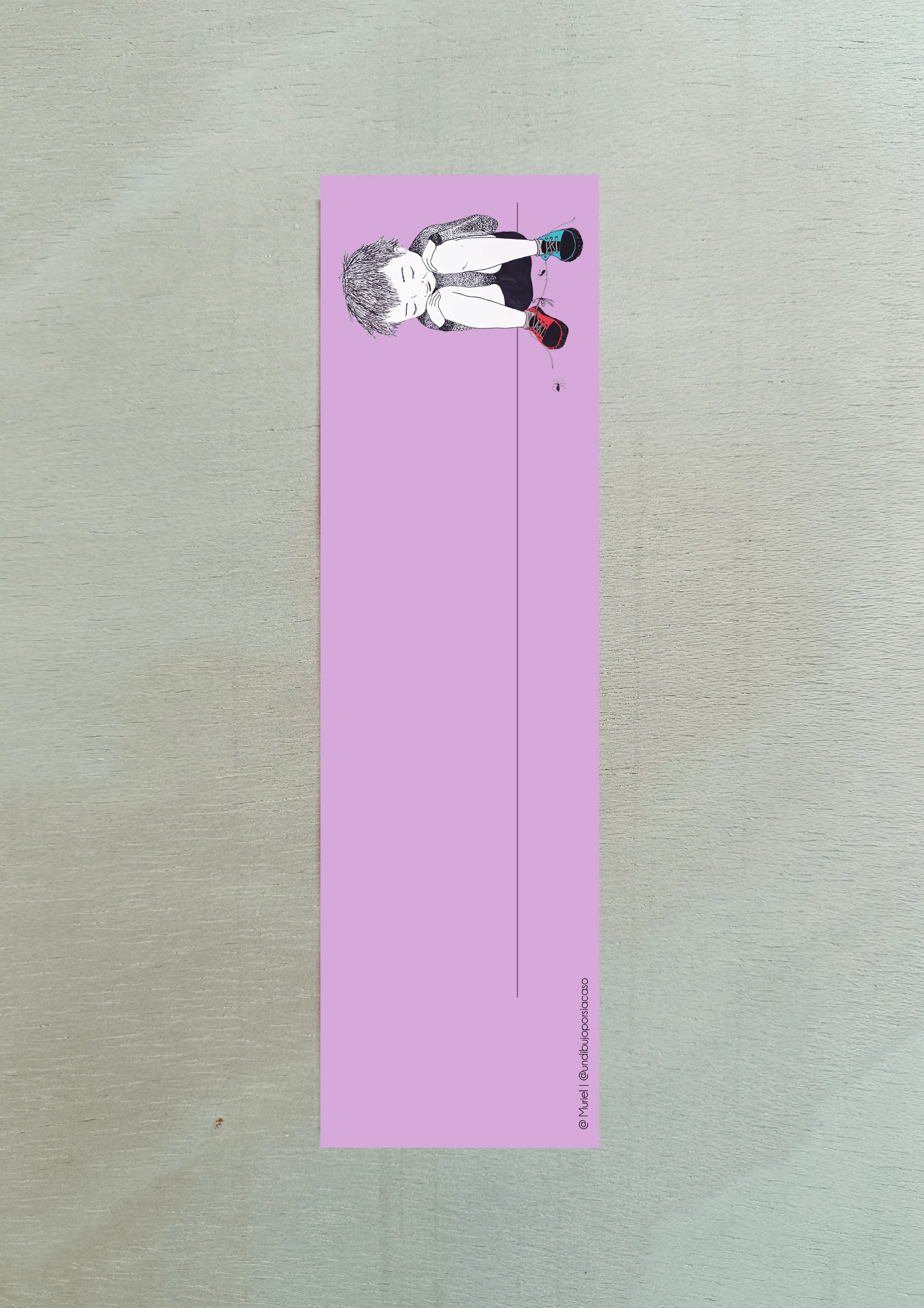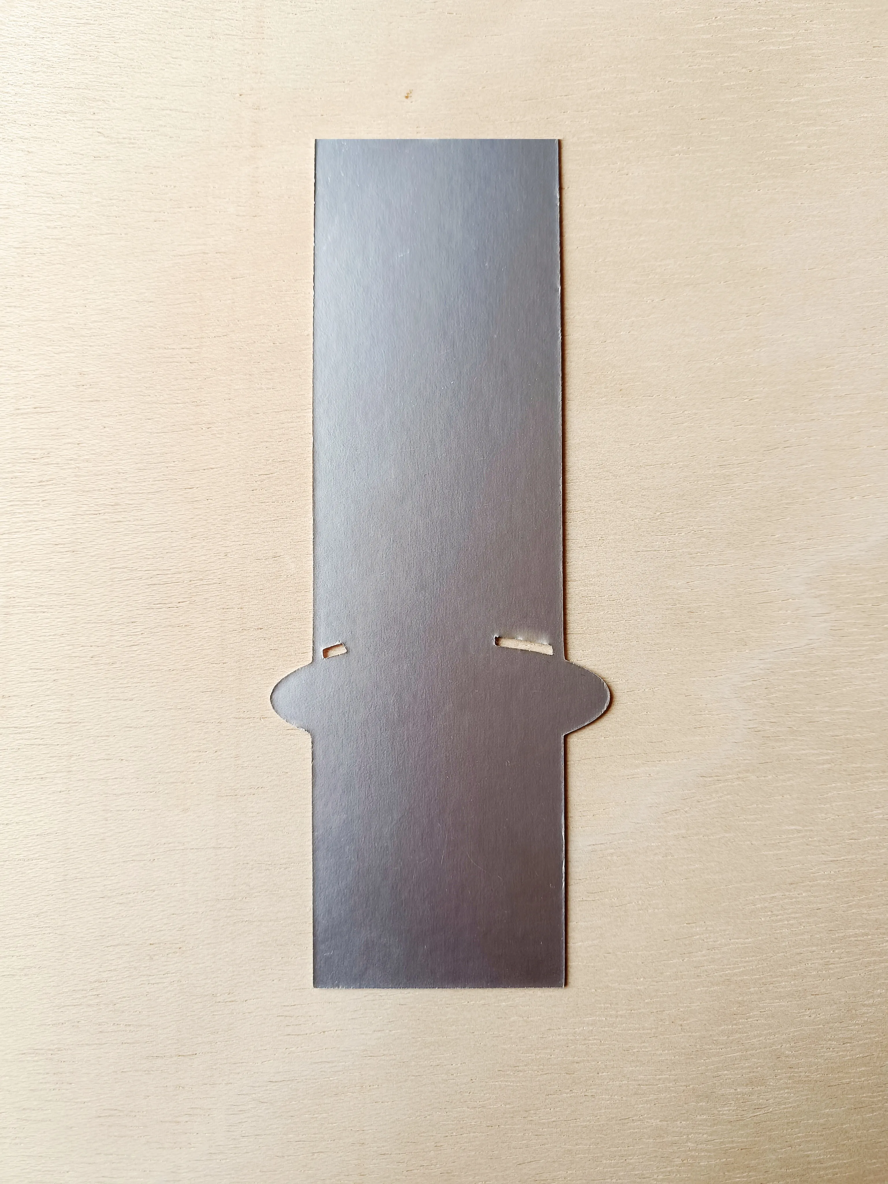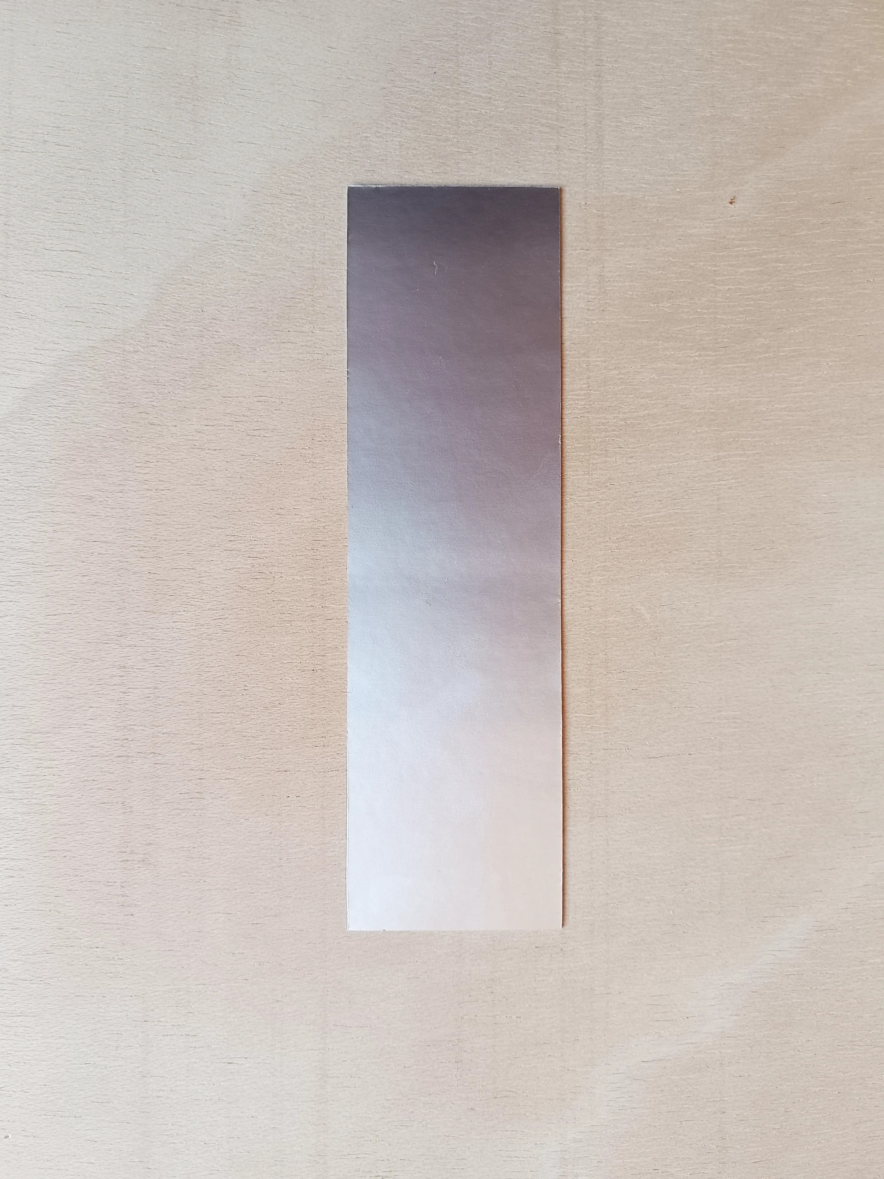Marcapáginas plastificado por delante y forrado por detrás con papel de color plateado.